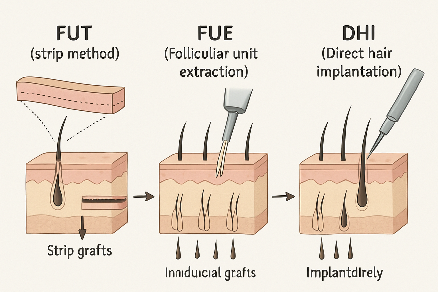 - Harvesting: Hair grafts are collected from the donor area using FUT, FUE, or DHI methods.